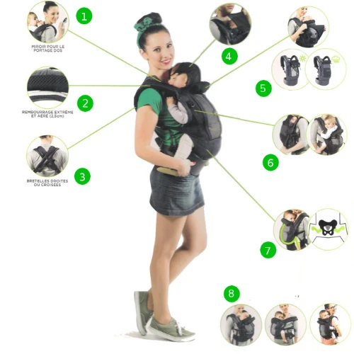 - It allows you to wear it in physiological position as soon as the birth with his pack extension.