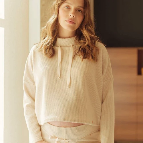 Its high collar is adjustable thanks to a pretty ribbon, its ribbed knit and its wide and short cut guarantee you a unique comfort to spend the winter. The pieces of the Sweet Home collection are designed to offer you a cocooning pregnancy and a soft breastfeeding.