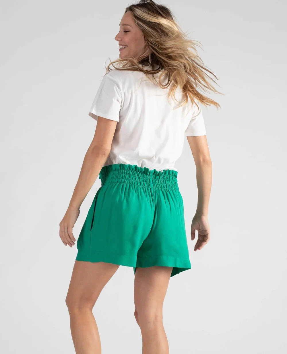 The green Nubie maternity shorts combine fluidity and comfort with their twill fabric and smocked elasticated waistband.