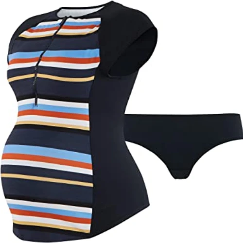 Biarritz maternity tankini two pieces. Biarritz surfs on the sportswear trend. Stripes are far from being old-fashioned and bring a chic and fun look to the pieces. This bathing suit offers an easy access to the breast thanks to useful and elegant zip.