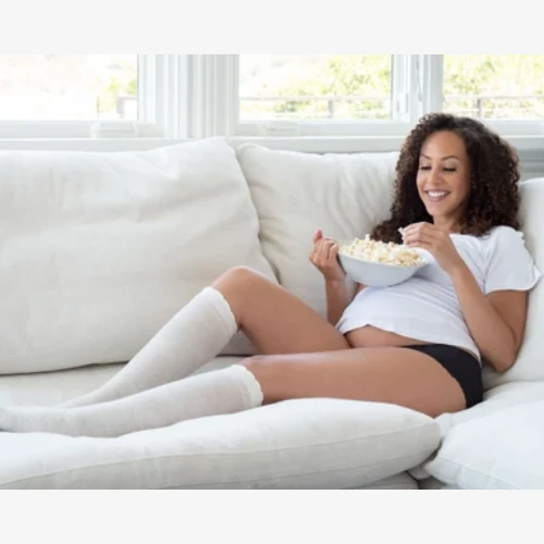 It’s a great idea to put your socks on first thing in the morning before any swelling occurs. If you’re already experiencing swelling, lay down and rest your legs on an elevated pillow for about 15 minutes to help reduce swelling before putting your socks on. Cornstarch or talcum powder can help compression socks slide on when your skin is either moist or too dry (Psssst…Not a great idea to try and put these on if you’ve first put lotion on your feet or legs).