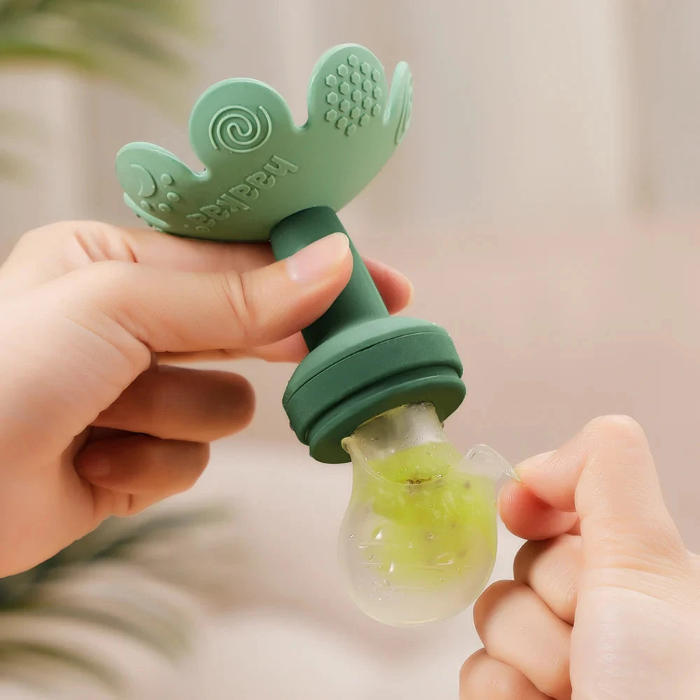 Our Feeder is super easy to assemble and use! Simply place fruit, vegetables or meat into the silicone pouch and seal right. You can also freeze icy treats straight into our Feeder. To do this, simply slip over the leakproof pouch cover, pour liquid (such as breast milk or puréed food) into the pouch, assemble the Feeder, place the cap on and freeze! Once frozen, remove the pouch cover and let your little ones explore! They will enjoy having the ability to experience new tastes and textures while also building independence, learning to self-feed, and improving their hand-eye coordination and fine motor skills.Â