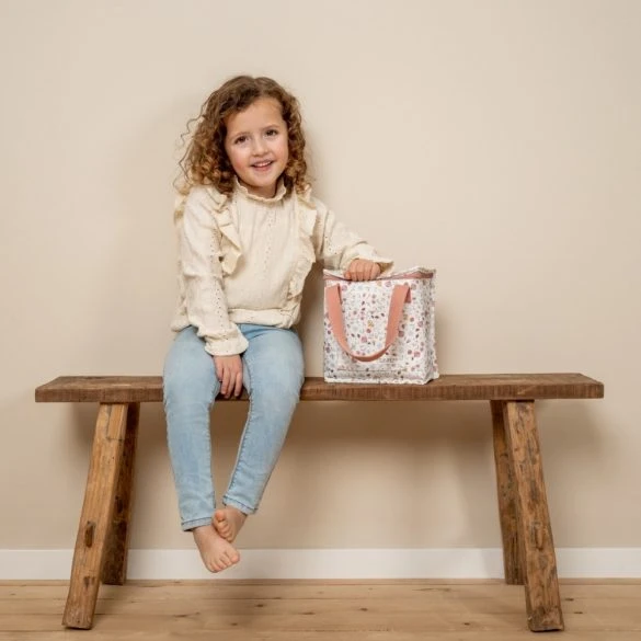 This cute cooler bag with Flowers & Butterflies print is made from sturdy canvas. The inside of the bag is insulated allowing snacks and drinks to stay nice and cool. Perfect for lunch at school and on the go! The cooler bag measures 21,5 x 20 x 12 cm. There is plenty of space for a lunch box, a piece of fruit and a bottle or drinks carton. The compartment in the front can hold a biscuit and the handles make it easy for your child to carry the bag.
