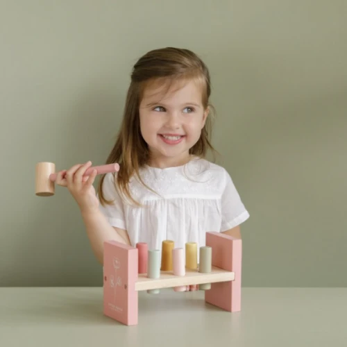Tap tap tap! Use the mallet to pound the 6 coloured pegs into the wooden pounding bench. This is a very good exercise for children’s motor skills. Finished pounding? Turn the bench over and start again! This will keep children entertained for a while.