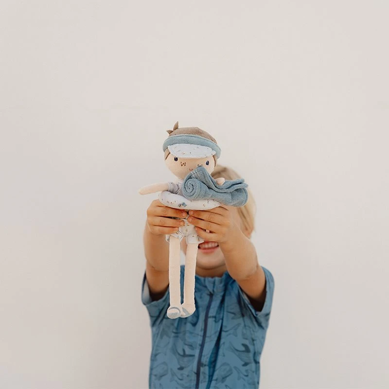 Meet cool Jim. He’s ready for a day of water fun! This plush cuddle doll in sandals, wearing his nautical swimsuit from the Sailors Bay collection, can’t wait to be cuddled. His summer outfit is completed with matching sun visor hat and the best essential for playing in the water; a swim ring. He is always in for building a sand castle, or playing with water and treasure hunting at the shore. Jim will be your new best friend. Whenever you would like to play or need a big hug, he is right there at your side. Bring his swim ring and towel to discover endless summer adventures together. Jim is soft and cuddly, 35 cm tall and comes in a beautiful storage box.