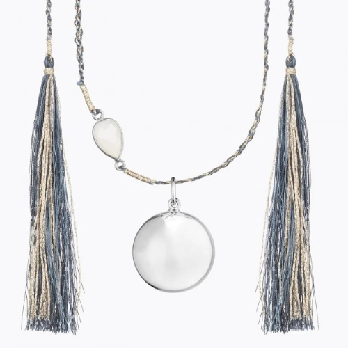 The soft tinkling chime of this necklace will create an aura of calm and peace for you and your baby. The brilliance of the perfectly smooth spherical pendant exquisitely contrasts with the matte finish and irregular texture of the hand-braided silk cord. The finishing touch a natural stone chosen for its healing benefits during pregnancy, a moonstone, known for its protective qualities for expectant mothers and their babies.