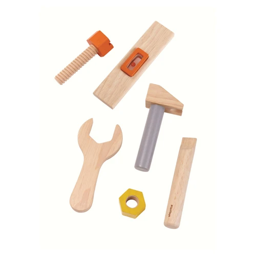 a screwdriver and a level. Kids can practice using these tools with a nut and a bolt that include in the set.